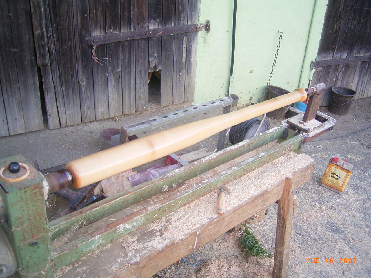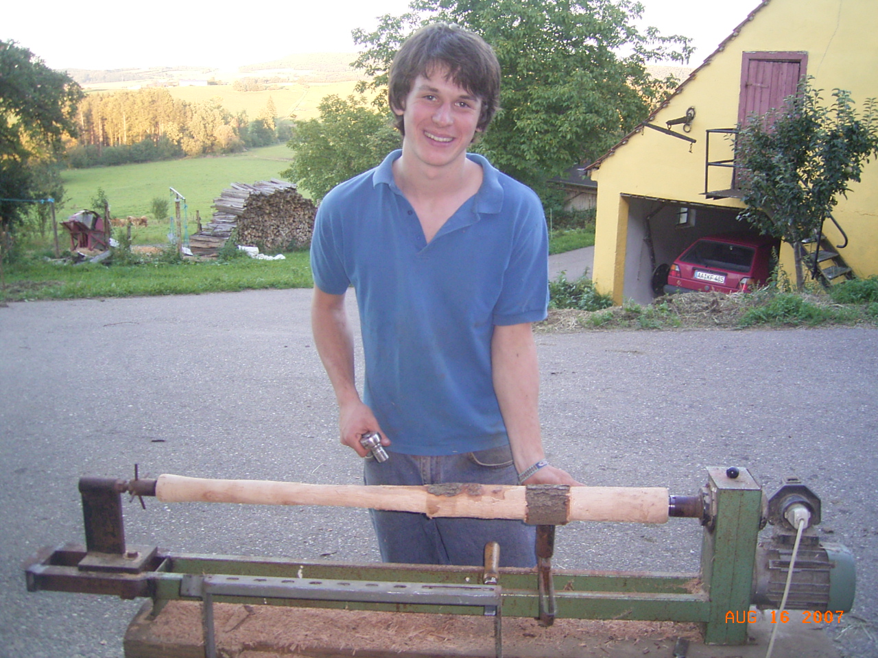 Diesen Sommer (07) war mein Cousin Bernhard aus Mähringen ein paar Tage hier bei uns in Mohrenstetten. Er hatte einen zusammengeleimten Holzklotz von einem Schreiner mitgebracht, mit der Idee daraus einen Baseballschläger zu drechseln. Da sich das sehr interessant anhörte haben wir uns auch gleich ans Werk gemacht. Zuerst musste die schon ins Alter gekommene Drechselbank, welche nur noch als Strickmaschine eingesetzt wird, von unnötigen Aufbauten befreit werden. Dann haben wir (Bernhard, Bene, ich) ihr, da sie für einen Baseballschläger einfach zu kurz war, hinten noch ein Stückchen Führungsschine angeschweißt.Nachdem die Drechselbank startklar war wurde der Holzklotz noch leicht vorgerundet und dann rein in die Maschine. Nach einiger Übung und öfterem schärfen der Stechmeisel, nahm der Holzklotz schnell an Form an. Als er dann schon fein nachgeschliffen und mit Leinöl eingelassen war stellten wir beim nachwiegen fest dass