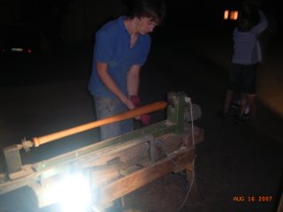 er leider noch viel zu schwer war. Also wieder eingespannt und das ganze nochmal...Und weil das Drechseln an einem warmem Sommerabend so viel Spass machte haben wir uns gleich ein zweites mal ans Werk gemacht, diesmal mit einem getrockneten Eschenstück. Anfangs war´s etwas schwieriger, da das gute Stück (eben wie gewachsen) nicht rund lief. Es musste auch einiges an Holz weg bis der werdende Baseballschläger endlich rund wurde - deshalb wurde er auch dünner und leichter als der Erste.