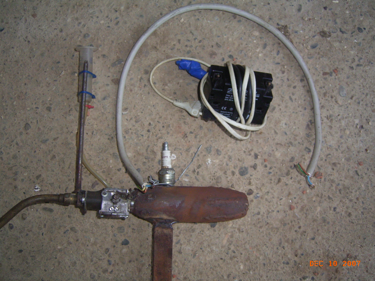 Diese Düse kann sich nicht selber am laufen halten sonder braucht Luftzufuhr über einen Kompressor (Anschluss links im Bild). Die Druckluft vermischt sich in einem Motorsägenvergaser mit Benzin (dieses kommt aus der Spritze links oben) und kommt dann in den Brennraum (einfach ein Rohr welches sich verjüngt). Dort wird dann das Gemisch über eine Zündkerze gezündet. Die Zündkerze bekommt ihre Spannung von einem Hochspannungstraffo aus einer Ölheizung.