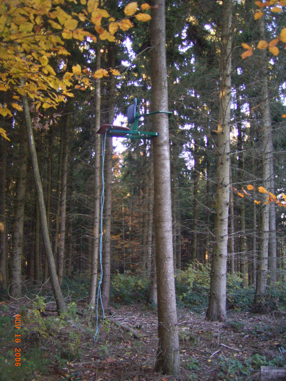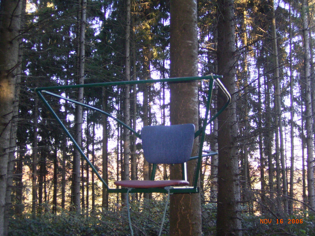 ich dann, zur weiteren Konstruktion keine Zeichnungen, sonder durchdenke die Sache im Kopf, aber weil ich ein par Dinge mit meinem Onkel, auch Jäger, abklären wollte, gab´s dann halt doch ne Zeichnung. In dieser "technischen Zeichnung" kann man dann auch die Funktionsweise erkennen. Durch den Hacken an der Rückseite des Sitzes, entsteht über die Gewichstkraft des Jägers, ein Moment welches den Sitz an den Baum drückt. Durch die Reibung, erhöht durch ein Stück Geweberiemen zwischen Baum und Sitzunterkante, wird der Sitz dann am "runterrutschen" gehindert. Damit der Sitz an den verschiedenst dicken Bäumen wagerecht hängen kann, lässt sich der Abstand der Sitzunterkante zum Baum, über ein ausziehbares Profil, variieren. Es stellte sich dann noch die Frage welche Farbe besser wäre - grün, zwecks Tarnung und passend zur Waldfarbe, oder in leuchtender Farbe zwecks guter Erkennung für Passanten. Da grün noch vorrätig war, hat sich das dann erübrigt...So sieht dann der fertige Hochsitz aus. Die Sitzfläche und Lehne sind von einem normalen Stuhl übernommen und etwas ausgebessert worden. Unten dran Hängt eine Strickleiter, es hat sich allerdings herausgestellt, dass diese recht unpraktisch zum besteigen des Hochsitzes geeignet ist. Der Bene hat sich dann selber ne leichte Holzleiter aus Stangen gemacht.