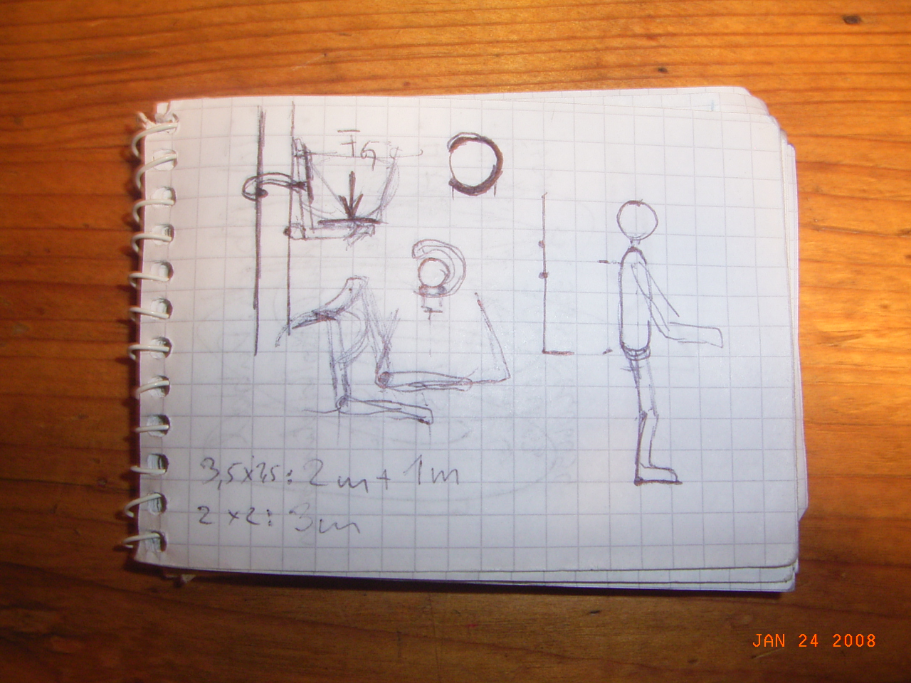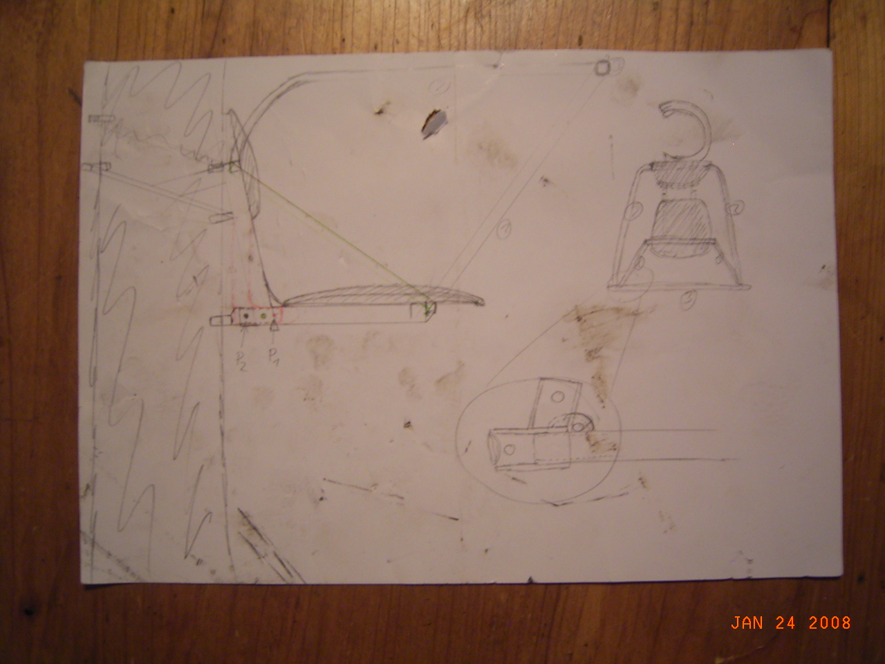 Bene, Geburtstag. Da er 18 wurde, und somit vollens an seinen Jagdschein gelangte, dachte ich wäre ein tragbarer Hochsitz doch ein passendes Geschenk. Und weil mir derzeit, in den meist nutzlosen Mechanikvorlesungen (bei einem "gewissen Professor") sowieso langweilig war, fing ich an erste Entwürfe auf nen Notizblock zu kritzeln. Erstmal musste das Verhältnis von Sitz zur Körpergröße passen und dann grob durch überschlägige Berechnung ein Stahlprofil welches der Belastung standhält festgelegt werden.Normalerweise mache